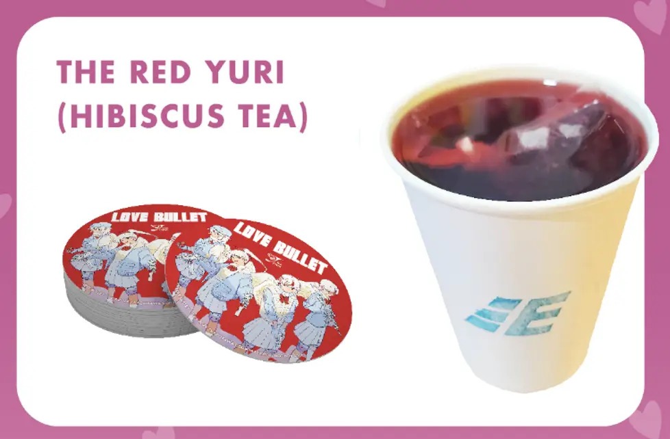 - The Red Yuri: 12 oz hibiscus tea that comes with a 3.7″ Love Bullet round coaster – $4.50