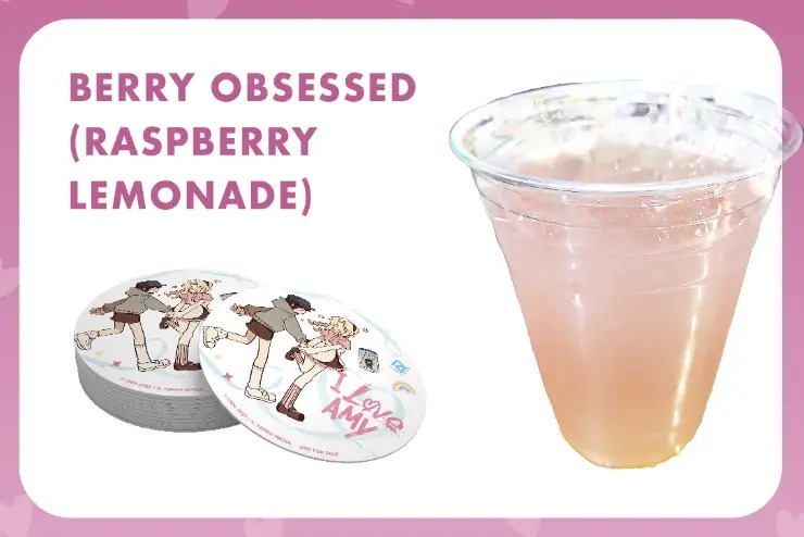 - Berry Obsessed: 12 oz raspberry lemonade with a 3.7″ I Love Amy round coaster – $5.50