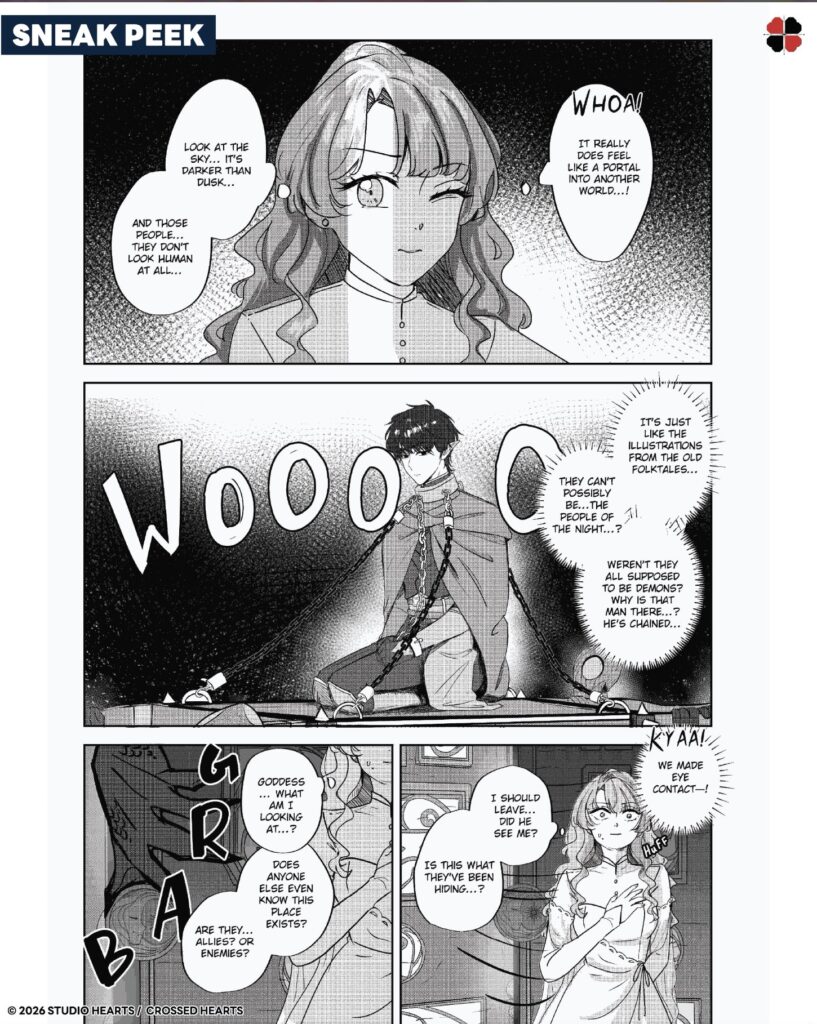A few days later, on April 5, the first work from Studio Hearts was revealed. Chiaroscuro is an original fantasy work that follows a princess who suspects she may have been chosen as a sacrifice to save her people from a world-ending disaster. Character sheets and some sneak peek pages can be seen below: