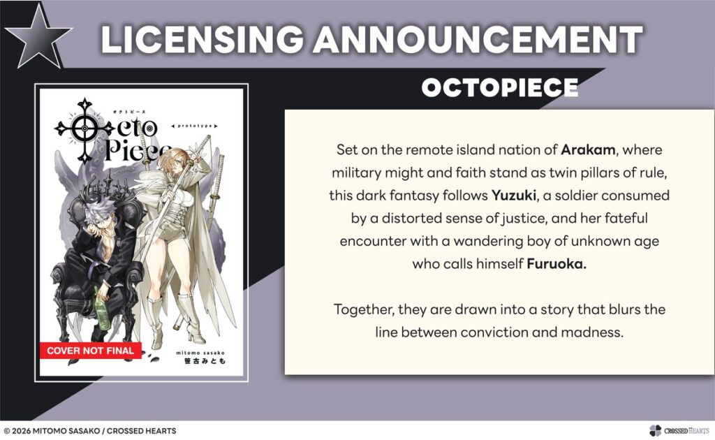 OctoPiece, written and illustrated by Mitomo Sasako, is a fantasy work that Sasako sold on the Booth marketplace in March. The manga appears to consist of two volumes but it is unclear if Crossed Hearts will be publishing it as a one-shot or in two volmes. The publisher has not announced a release window for the work yet.