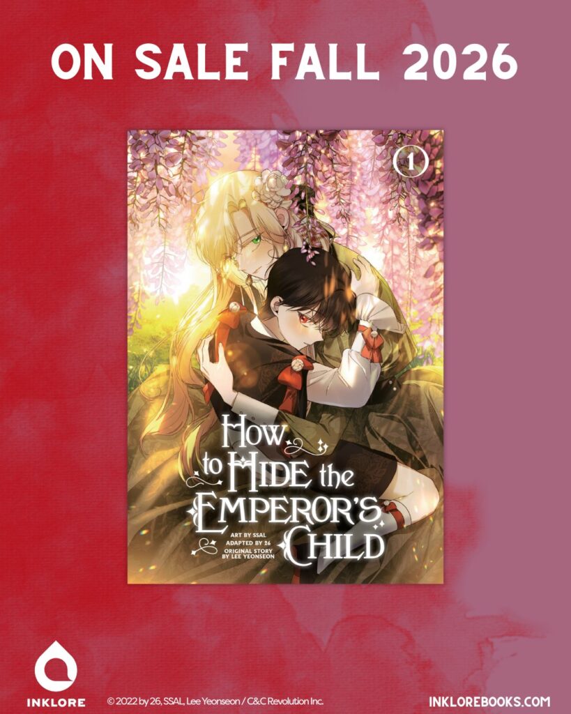 That sentiment is exemplified in Inklore’s cover reveal of How to Hide the Emperor’s Child. Under a canopy of pink flowers, Astelle protectively embraces her son Theore, her eyes cautious and wary. Sun shines down, turning her hair into spun gold. The manhwa, based on an original webnovel by Lee Yeonseon and was originally published by CL Production, will release in the fall 2026.