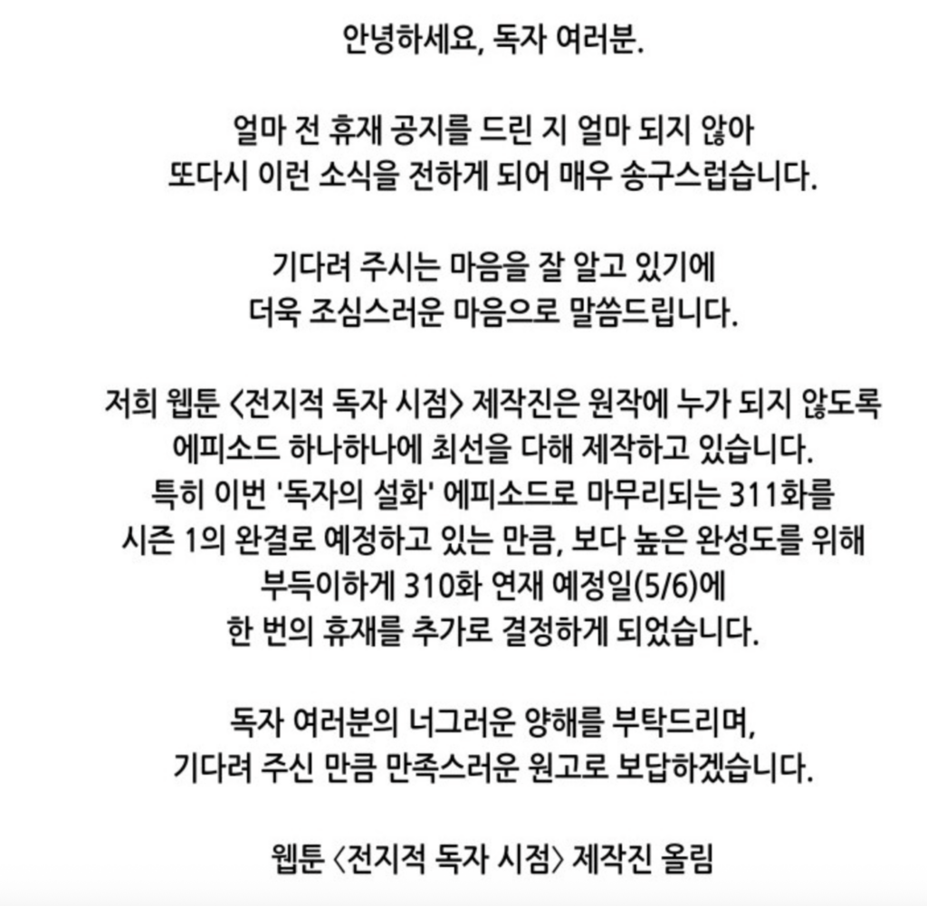 The popular webcomic Omniscient Reader’s Viewpoint will be taking a short break next week on May 6 to ensure the next chapter is of the utmost highest quality. The announcement comes at the end of the most recent chapter, Chapter 309. In addition, Chapter 311 will mark the end of the first season of ORV. The production team asked fans for their patience as they worked to adapt the webcomic so that it would be as faithful as possible to the original novel.