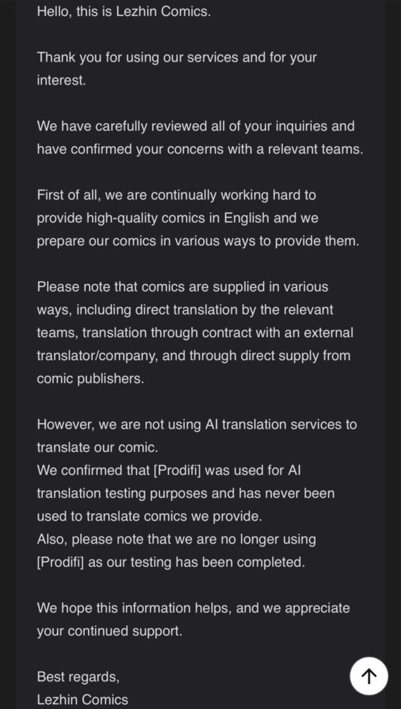 “We confirmed that [Prodifi] was used for AI translation testing purposes and has never been used to translate comics we provide. Also, please note that we are no longer using [Prodifi] as our testing has been completed.”