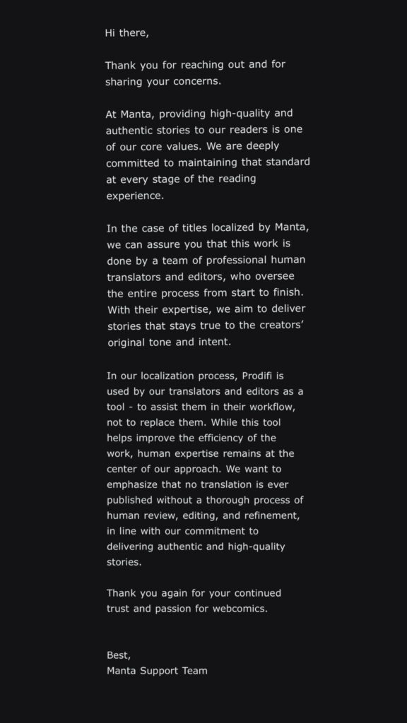 Although Manta’s support team wrote that titles localized by Manta will be worked on by “professional human translators and editors, who oversee the entire process from start to finish,” they have also admitted that Prodifi is being used as a “tool.”