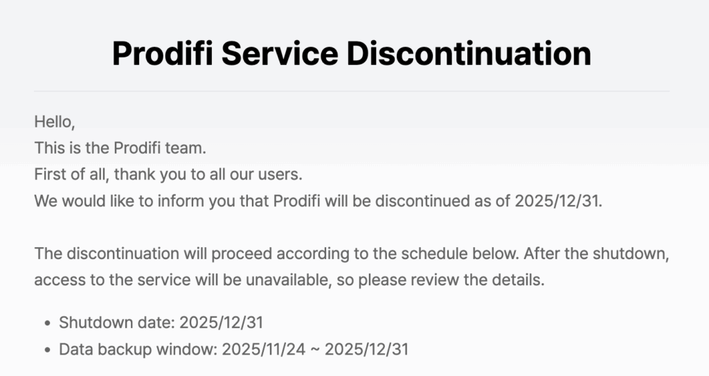 The notice appeared on the Prodifi website where it states the site will be discontinued as of December 31. By then, all data on the platform will be deleted, the customer support service will be closed, and the website completely shut down. There is no explanation as to what the internal service strategy adjustments were to lead to the discontinuation.