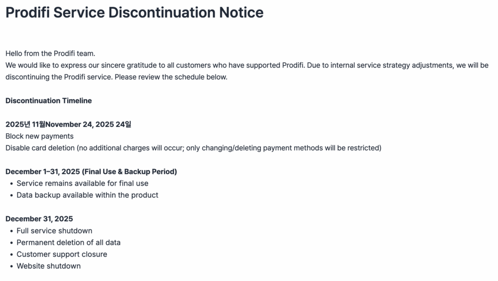 Prodifi, the subsidiary of RIDI, has announced a service termination next month due to “internal service strategy adjustments.”
