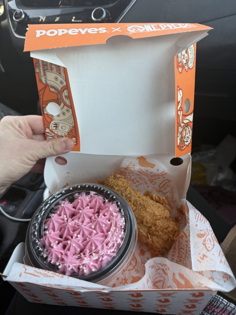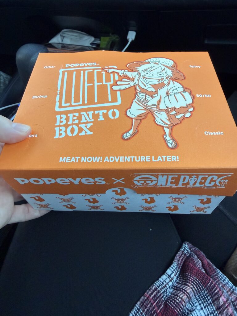 Right now at Popeyes Chicken, you can get the One Piece x Popeyes collab food. This includes the Luffy Bento Box, Gum-Gum Lemonade and Chopper’s Cupcake. Your favorite husband-and-wife food reviewers swung through the local Popeyes drive-thru to taste this delicious collab for ourselves.