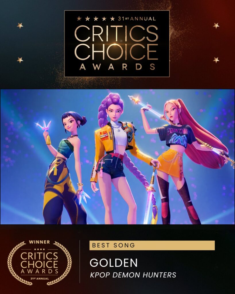 The film won “Best Animated Feature,” against nominees that include Arco, Zootopia 2, Little Amélie or the Character of Rain, Elio, and In Your Dreams. Written by EJAE, Mark Sonnenblick, Ido, 24, and Teddy, “Golden” won “Best Song,” against F1‘s “Drive,” Sinners‘s “I Lied to You,” Train Dreams‘s “Train Dreams,” Wicked for Good‘s “The Girl in the Bubble,” and The Testament of Ann Lee‘s “Clothed by the Sun.”