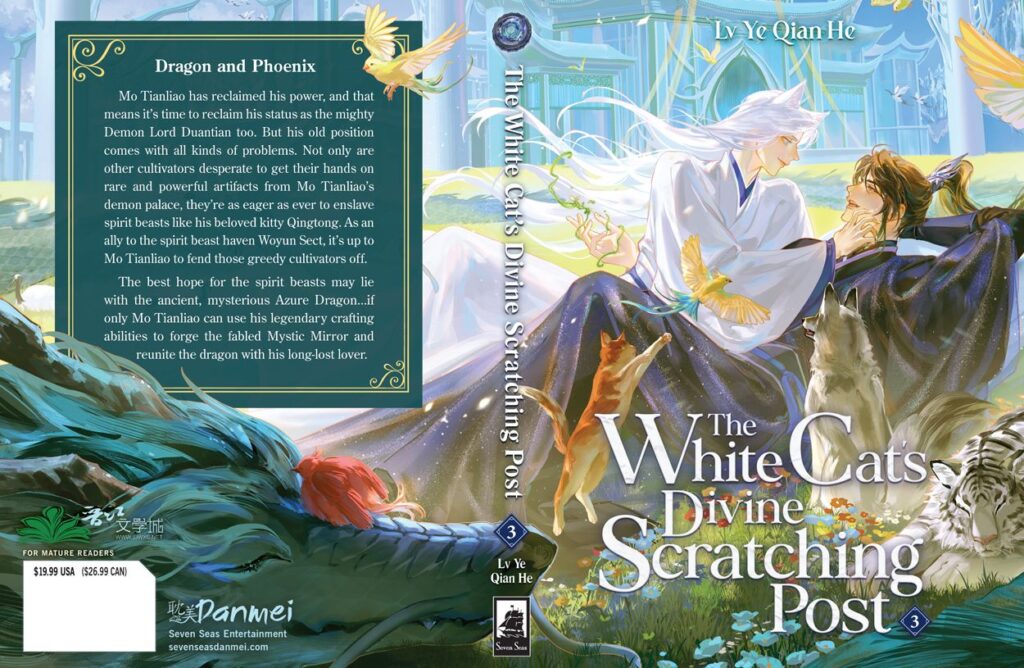 Seven Seas revealed the third and final volume cover of The White Cat’s Divine Scratching Post. Although the series will not have a special edition, fans will still be happy with the gorgeous cover Bakuten illustrated as well as the interior artwork. Similar to the second volume, the cover showcases Mo Tianliao and Qingtong together with Qingtong lovingly stroking his lover’s face. Surrounding them are birds, a cat, a dog, and a slumbering tiger and dragon. raccoon, fittingly, considering the premise of the series, translated the series.