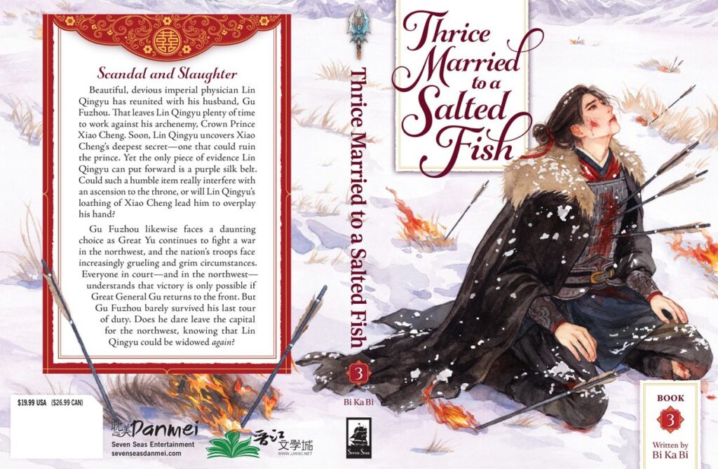 Seven Seas Entertainment revealed a new danmei cover this week and they apparently concluded that January blues wasn’t sad enough and fans needed to be emotionally and psychologically harmed. The third cover of Thrice Married to a Salted Fish showcased the Great General Gu Fuzhou kneeling in the snow as he bleeds out from the wounds he suffered. Surrounding him are flaming arrows as he gazes out at nothing. Mio illustrated the cover and Mulliga K. illustrates the interior artwork. Mimi, Huayu, and Eli are translating the series.