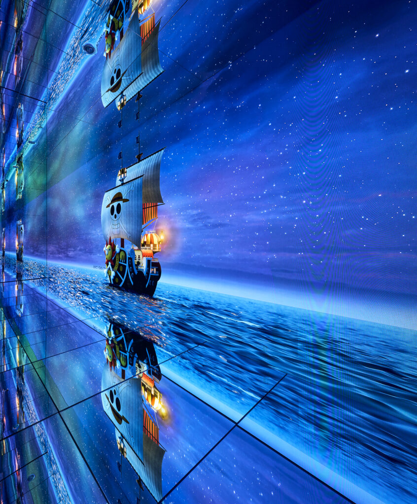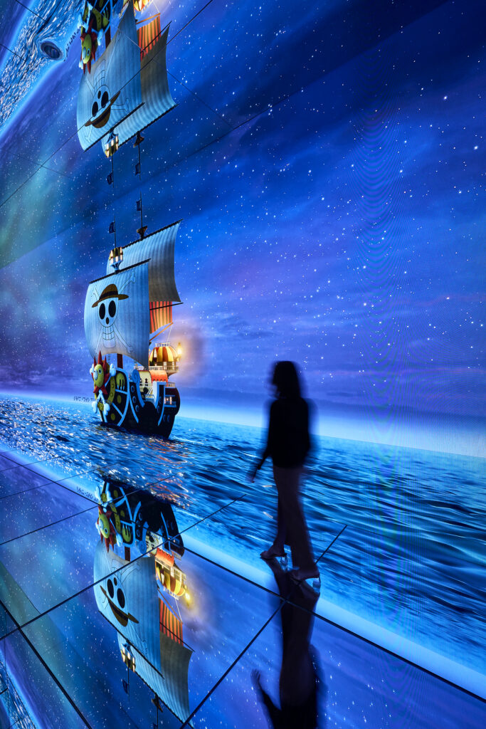 The Infinite Room surrounds visitors with mirrored walls and a massive 1.5-pitch screen displaying the Thousand Sunny drifting endlessly across the sea and sky.