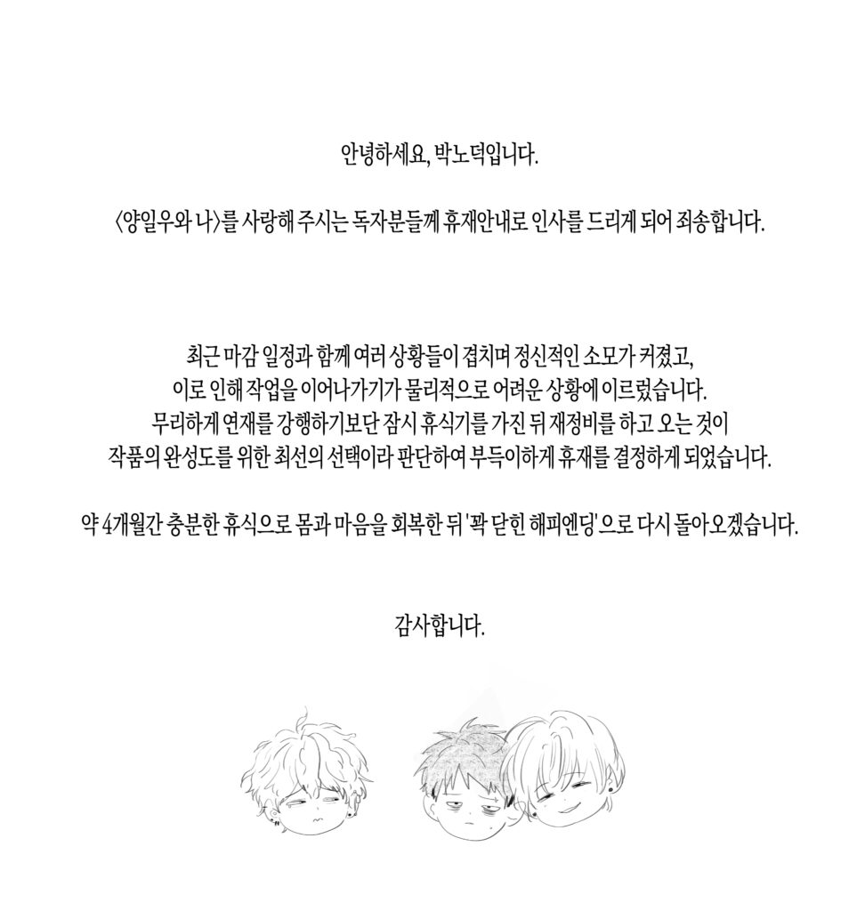 Yang Ilwoo and Me will not release any new chapters for approximately four months.